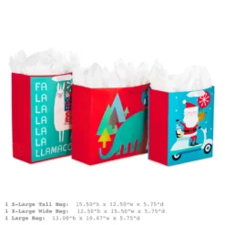 - Pack includes 1 large and 2 XL gift bags in assorted kid-friendly Christmas designs. Large Santa bag and XL dinosaur bag feature glitter accents and all bags include a gift tag.