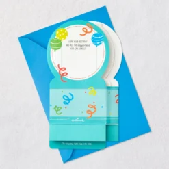 Pop-up birthday greeting card features a laser-cut, dimensional scene of colorful balloons and a “Happy” message inside of a 3D molded plastic snow globe-style design. Musical card plays a fun instrumental version of “Happy Birthday” while confetti blows inside when button on front is pressed. Simply unfold the card to create a fun surprise—no assembly required—that can be displayed on any tabletop. When open for display, 3D pop-up card measures approx. 7.25″ H.
