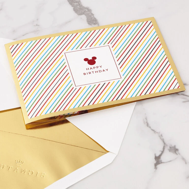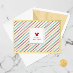 Pop-up birthday greeting card features a mouse ears icon in prismatic red foil paired with colorful stripes, a gold foil border and a “Happy Birthday” message on the front. Simply open the card to reveal the 3D pop-up surprise inside—no assembly required: an intricate, laser-cut layered birthday cake pops out with Mickey on top while Pluto keeps an eye on the presents. Die-cut balloons, festive patterns and foil accents add to the fun. This cheery card crafted from premium card stock is a work of art sure to be displayed all year long, making it an unforgettable way to share happy birthday wishes with a special kid or Disney fan. When open, this pop-up card lays flat for display; 3D pop-up inside measures approx. 5″ tall.