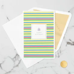 Pop-up birthday greeting card features cheerful stripes with a metallic silver foil birthday cake and “happy birthday” message on the front. Simply open the card to reveal the 3D pop-up surprise inside—no assembly required: intricate layers of colorful laser-cut stars, streamers, confetti and happy birthday wishes accented with sparkly glitter and shimmering silver foil pops out. This fun birthday card crafted from premium card stock is a work of art sure to be displayed all year long, making it an unforgettable way to wish a special kid, friend or family member a very happy birthday. When open, this pop-up card lays flat for display; 3D pop-up inside measures approx. 3.5″ H.