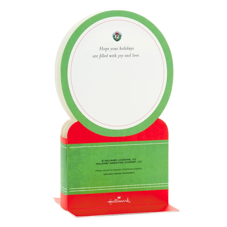 Musical pop-up Christmas greeting card with motion features a laser-cut, three-dimensional snowy scene of an antique red truck and a charming mountain village inside of a 3D snow globe-style design. Musical card plays the song “We Wish You a Merry Christmas” while “snow” blows inside when button on front is pressed. Simply unfold the card to create a fun surprise—no assembly required—that can be displayed all season long. When open for display, 3D pop-up card measures approx. 7″ H.